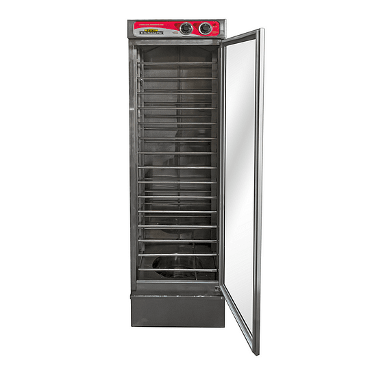 La cámara de fermentación modelo FPK 15 d mejorará la fermentación de tus masas gracias a que permitirá que la masa de pan fermente de manera uniforme. Con la cámara de fermentación podrás controlar el nivel de calor y humedad de manera precisa, por lo que en todo su interior tanto el calor como la humedad se encontrará uniforme logrando que tus preparaciones tomen un volumen deseable. Nuestras cámaras fermentadoras cuentan con un perfecto sistema de 4 factores; Humedad, Temperatura, Tiempo y Ventilación. Está posee un bowl de 8 litros en donde se debe mantener con agua para facilitar el proceso de humedad de la fermentadora.