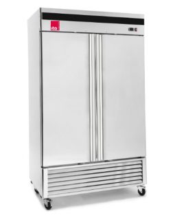Control electrónico de temperatura y deshielo, con visor digital. Evaporación automática del agua al deshielo. Sistema de refrigeración por aire forzado. Base con 4 ruedas y 2 frenos.