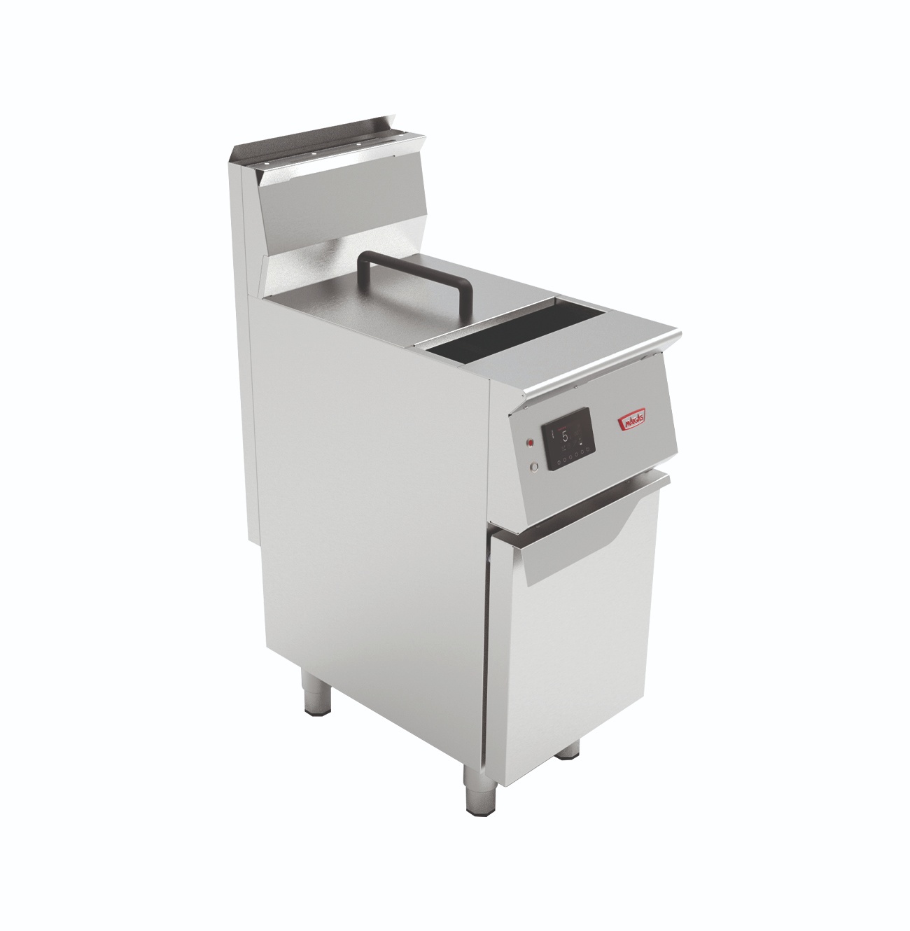 Freidora 400 fabricada íntegramente en acero inoxidable calidad AISI 304. Es un equipo robusto para soportar su uso industrial. Posee una puerta abatible con cierre magnético. Para la regulación de temperatura posee un Moderno Display Gráfico provisto de diferentes funciones que permite tener un control mas preciso y automático en el proceso de cocción. Cuenta con una luz piloto y un botón de reset en caso que se requiera. Para la seguridad cuenta con un termostato de seguridad y un ventilador.