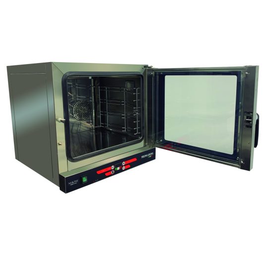 Gran horno convector de sobremesa de tecnología avanzada, solido, rápido y preciso, por su tamaño puede ser ubicado en lugares reducidos y es muy silencioso.Cámara de cocción de acero inoxidable con esquinas redondeadas para una fácil limpieza y mantención. Componentes italianos de alta calidad, doble vidrio templado de baja emisividad, que lo hace seguro para altas temperaturas, mango con sistema de apertura de seguridad y base antideslizante.Panel digital de fácil manejo, puede cocer con las 4 bandejas en forma simultanea entregando un horneado de calidad, buena iluminación interior y sus 2 ventiladores hacen que los productos tengan una cocción homogénea con buen color y textura, especial para panadería y pastelería.