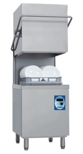 Maquina Lavavajillas de acero inoxidable modelo Fast 180. Eléctica trifásica 380V, potencia total absorbida 8KW, funcionamiento automático con control electrónico, con 2 programas de lavado de 60 y 120 segundos, con enjuague final automático, panel de mandos electromecánico, temperatura de enjuague controlado por thermostop, dispositivo de ahorro de energía.