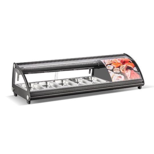 Vitrina Sushi Refrigerada 1.30 mts 5 bandejas acero inoxidable, trabaja entre 0 a 12° luz led interna, vidrio templado curvo abatible.